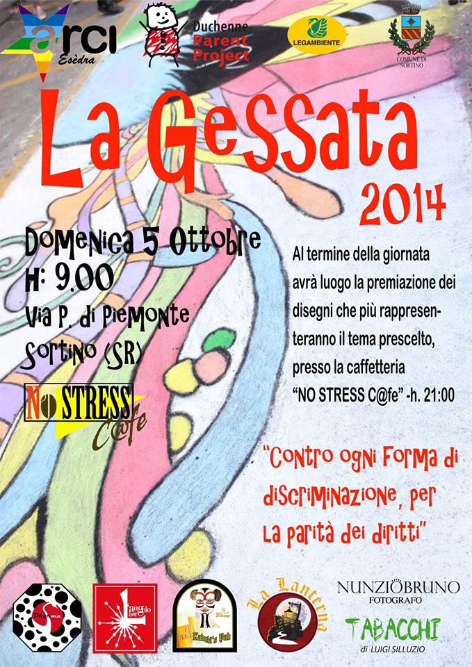 Domenica 5 Parent project organizzerà inoltre, insieme ad altre associazioni, “la Gessata” 2014 che vedrà impegnati tanti bambini a disegnere in strada ispirandosi a temi quali l’uguaglianza e la solidarietà .