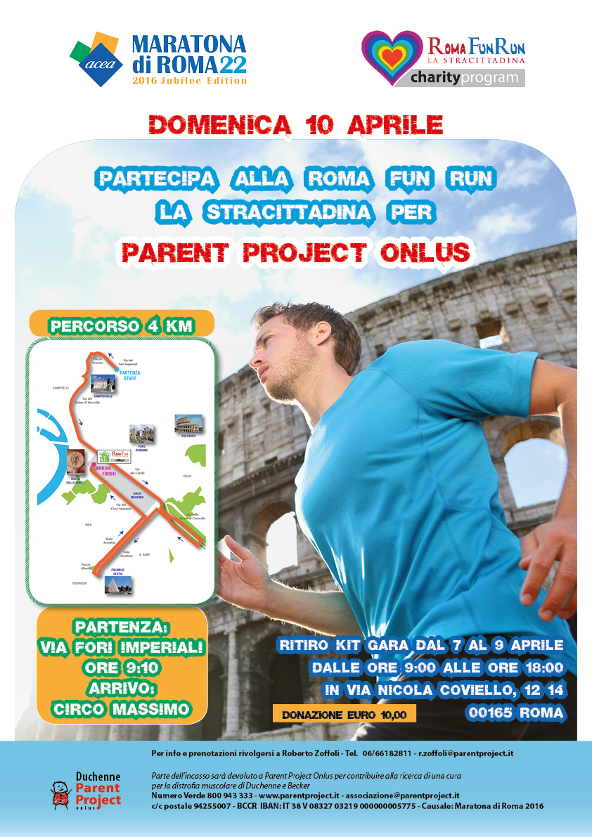Quest’anno Parent Project onlus, associazione di genitori di bambini e ragazzi con la distrofia muscolare di Duchenne e Becker, parteciperà al “RomaFun Charity Program”, il programma della solidarietà della Stracittadina. I sostenitori dell’associazione avranno, così, un’occasione speciale per correre contribuendo alla ricerca contro la distrofia muscolare di Duchenne e Becker.