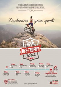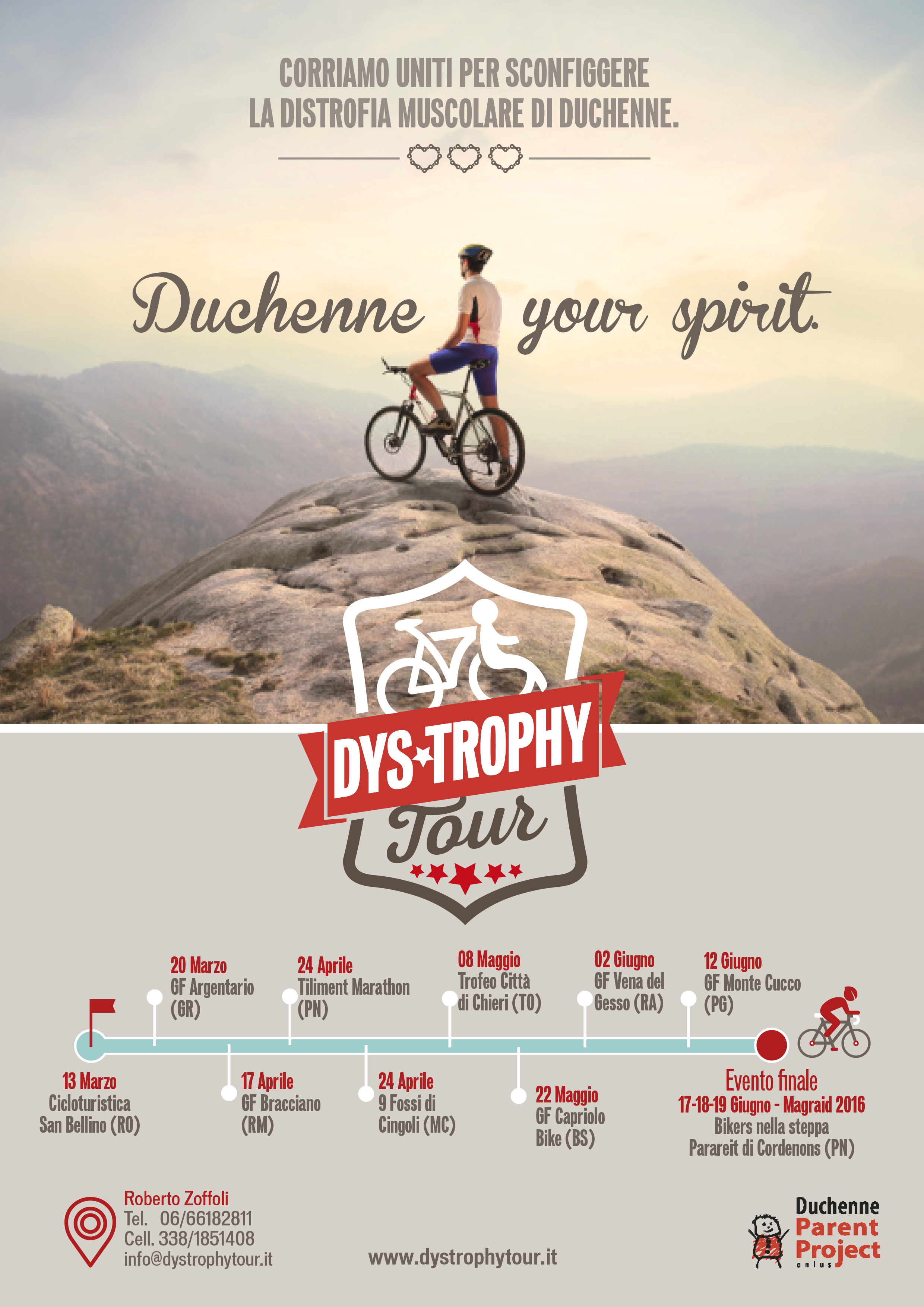 Il Dys-Trophy Tour è un circuito di 9 gare/ciclo-turistiche in mountain bike che ha come scopo il sostegno a Parent Project Onlus e che si articolerà nel periodo tra febbraio e giugno 2016: un’emozionante occasione per contribuire a supportare la battaglia contro la distrofia muscolare di Duchenne e Becker, attraverso un’iniziativa ad alto tasso di sport e divertimento.