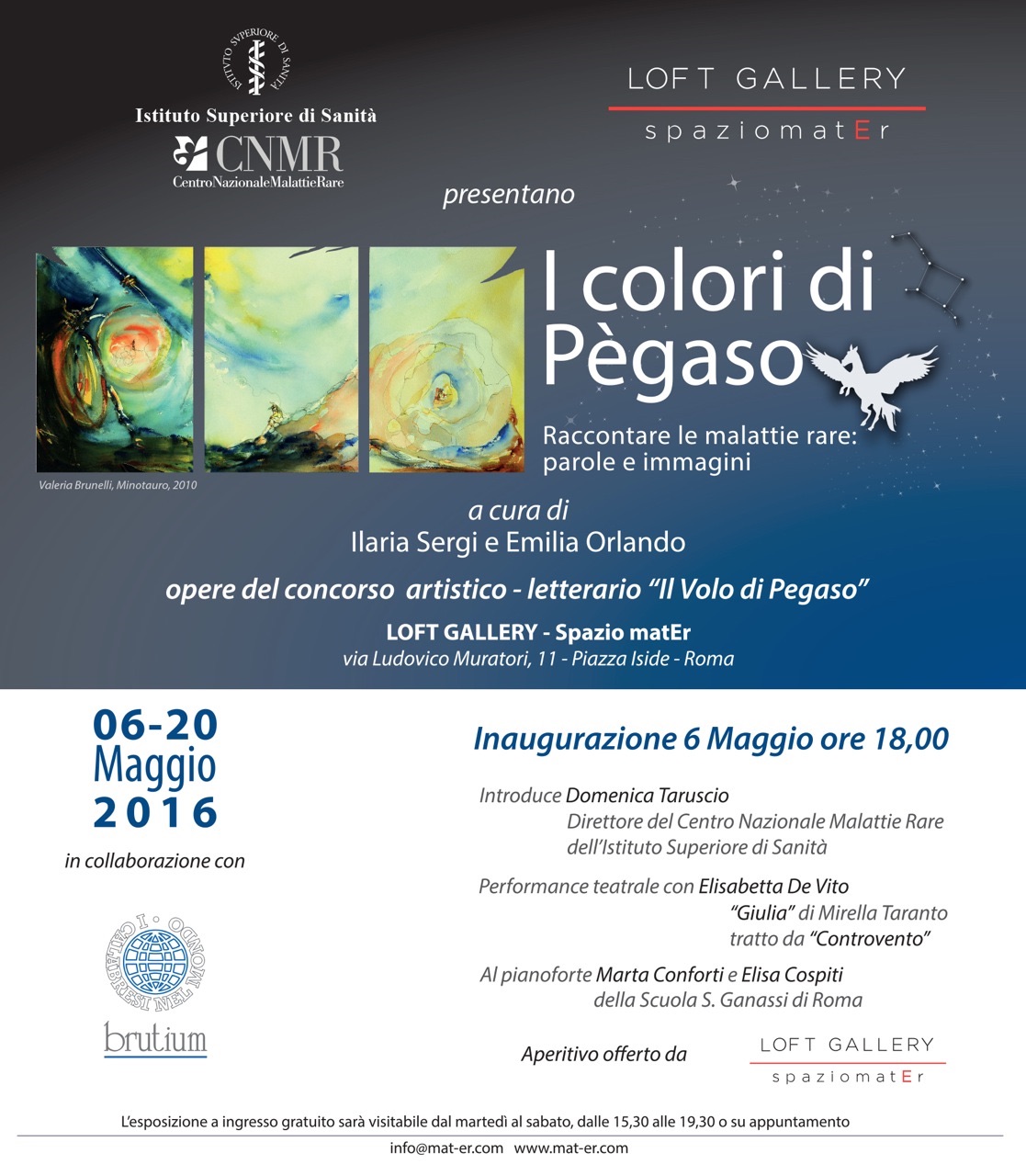 Si terrà dal 6 al 20 Maggio 2016, presso la Loft Gallery Spazio MatEr (via dei Muratori 11 – Roma), la mostra “I colori di Pegaso”, nella quale sarà esposta una selezione delle opere delle otto edizioni del Concorso artistico-letterario “Il Volo di Pegaso”.