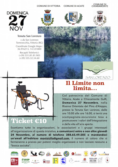 Domenica 27 novembre si svolgerà un’escursione accessibile nella Valle dell’Ippari, organizzata da MoVIS Onlus, con il patrocinio dei Comuni di Vittoria, Acate e ChiaramonteGulfi, in compagnia dei volontari della Protezione Civile di Vittoria e di Acate e la partecipazione delle associazioni Grotte Alte, Vittoria delle Finestre Rotte, Kalura, Parent Project, Farecivile, MPG Art, l’ANFFAS di Vittoria e Scoglitti, l’Ente Nazionale Sordi di Ragusa, il Rotary club di Comiso, l’Unione Degli Studenti di Vittoria, la UISP iblea, l’Orthomedica Sicilia, le associazioni sportive A.S.D. Ciclo Sport, A.S.D. Free Volley Vittoria, I Camminatori, Victoria Docet, Vittoria Rugby,