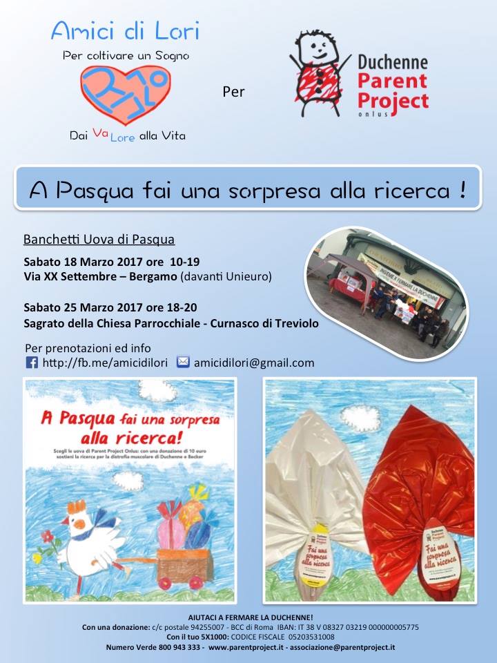 Sabato 18 marzo, per tutto il giorno, il gruppo “Amici di Lori” realizzerà in via XX settembre, di fronte ai numeri civici 14/16, un banchetto di uova di Pasqua solidali a favore di Parent Project onlus, nell’ambito della campagna nazionale “A Pasqua fai una sorpresa alla ricerca”.