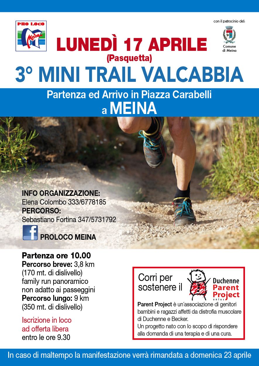 Lunedì 17 aprile si svolgerà a Meina (NO) la terza edizione del Mini Trail Valcabbia, evento podistico non competitivo organizzato dalla Pro Loco cittadina, con il patrocinio del Comune.