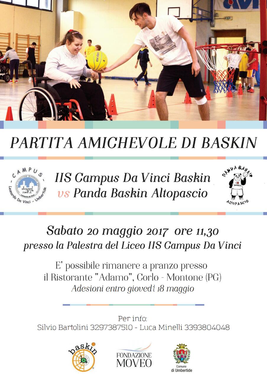 Sabato 20 maggio, alle ore 11.30, presso la palestra del Campus “Leonardo Da Vinci” di Umbertide (PG), si svolgerà una partita amichevole di baskin (basket integrato) tra la squadra locale e una squadra proveniente da Lucca.