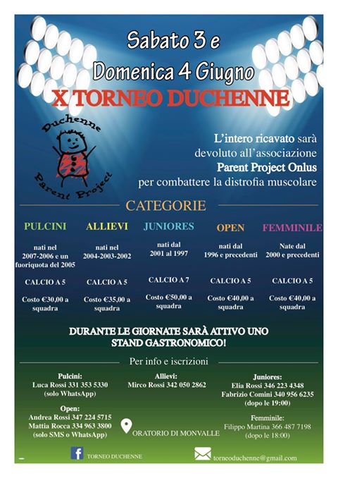 Sabato 3 e domenica 4 giugno si svolgerà , presso l’Oratorio e la Palestra comunale di Monvalle, la X edizione del Torneo Duchenne, un appuntamento dedicato al calcio a 5 e a 7 organizzato a sostegno di Parent Project onlus, con il patrocinio di C.S.I. Varese.