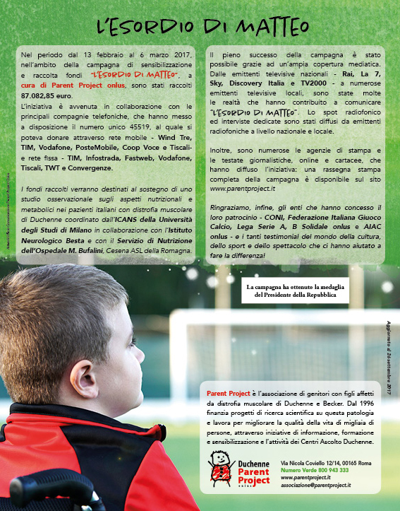 Oggi su “L’Espresso” una prima pubblicazione sulla campagna di Parent Project ” L’ esordio di Matteo” con la cifra raccolta ad oggi e i riferimenti di tutti i partner dell’iniziativa!