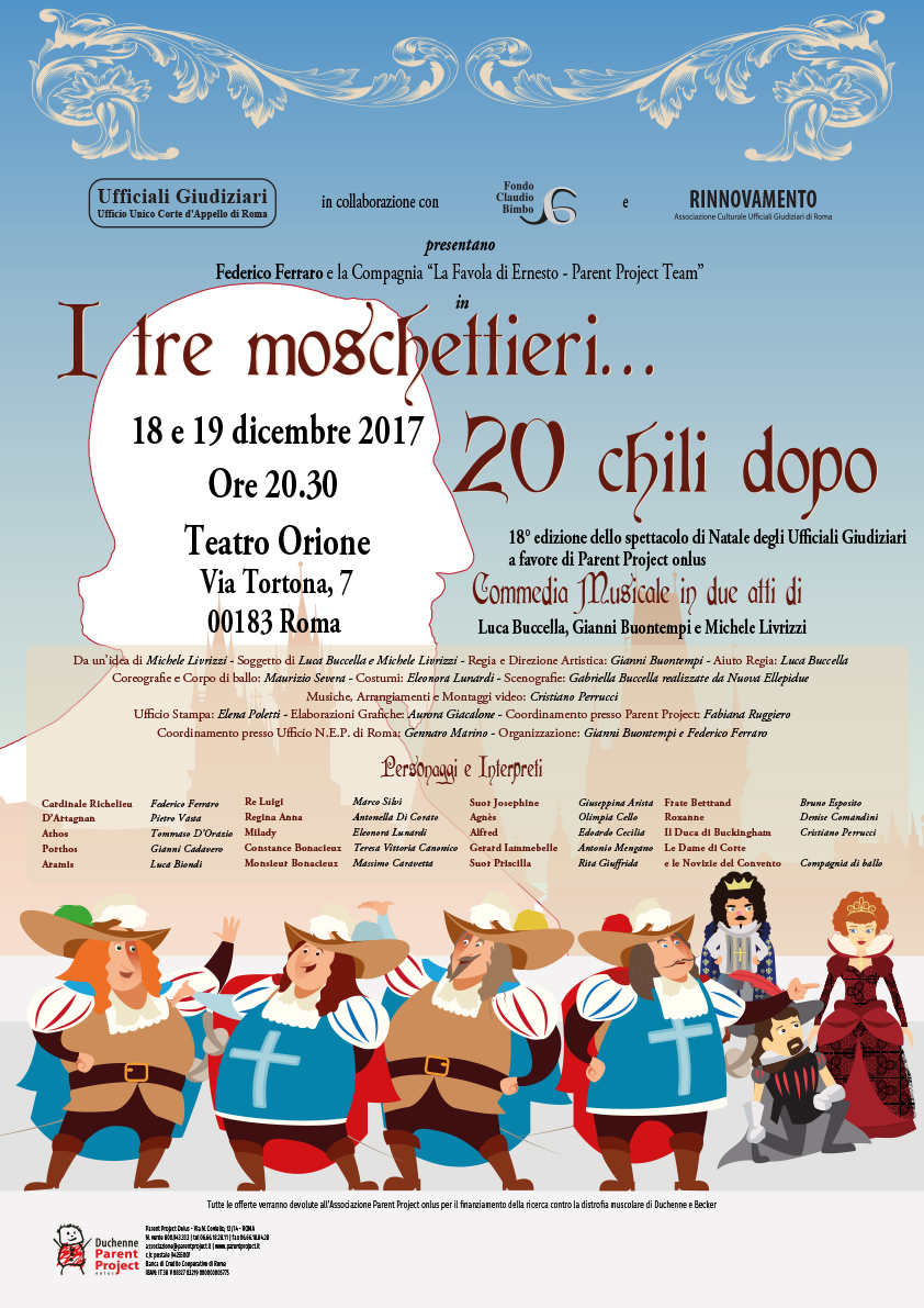 Per il 18mo anno, la compagnia, composta da Ufficiali Giudiziari della Corte di Appello di Roma e volontari, devolverà il ricavato delle due serate a Parent Project onlus. L’evento avviene in collaborazione con il Fondo Claudio Bimbo di Parent Project onlus e con Rinnovamento, l’Associazione Culturale degli Ufficiali Giudiziari di Roma.