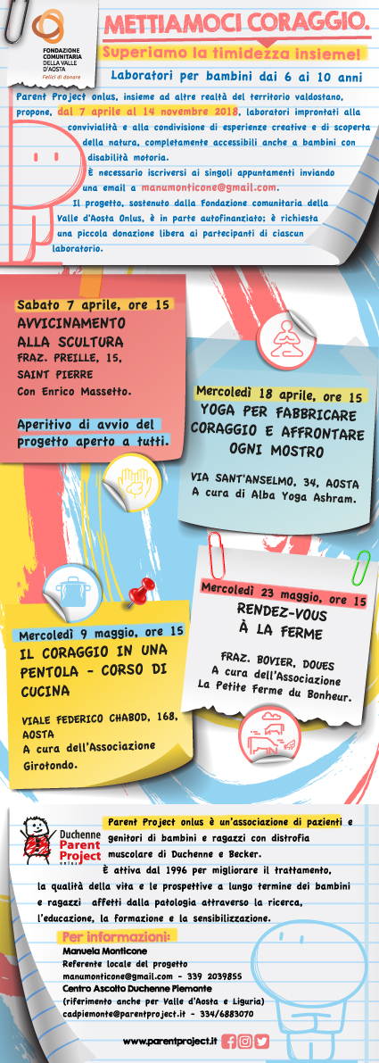 Parent Project onlus, l’associazione di pazienti e genitori di bambini e ragazzi con distrofia muscolare di Duchenne e Becker, insieme ad altre realtà del territorio valdostano, propone, dal 7 aprile al 14 novembre 2018, una serie di laboratori per bambini dai 6 ai 10 anni, organizzati nell’ambito del progetto “Mettiamoci coraggio. Superiamo la timidezza insieme!”.