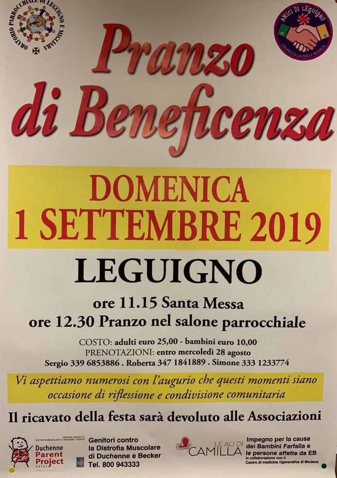 Domenica 1 settembre, alle ore 12.30, si svolgerà, presso la struttura parrocchiale di Leguigno, un pranzo solidale che andrà a sostenere l’operato di due associazioni: Parent Project, dedicata al supporto della ricerca sulla distrofia muscolare di Duchenne, e l’Associazione “Le ali di Camilla”.