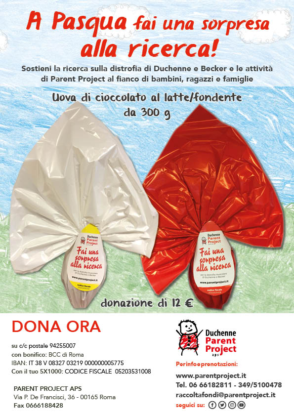 Parent Project donerà il 20% del ricavato della campagna “A Pasqua fai una sorpresa alla ricerca” alle associazioni NGO Duchenne Ukraine e Mio-Life. In questo modo, i fondi raccolti attraverso la diffusione in tutta Italia delle nostre uova al cioccolato andranno a sostenere, oltre a tutte le attività di Parent Project, anche le realtà che stanno lottando al fianco dei pazienti in questo contesto drammatico.