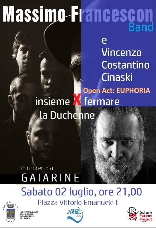 Sabato 2 luglio in piazza Vittorio Emanuele II a Gaiarine (TV), alle ore 21, si terrà un concerto della Massimo Francescon Band, in compagnia del poeta e performer Vincenzo Costantino “Cinaski”.