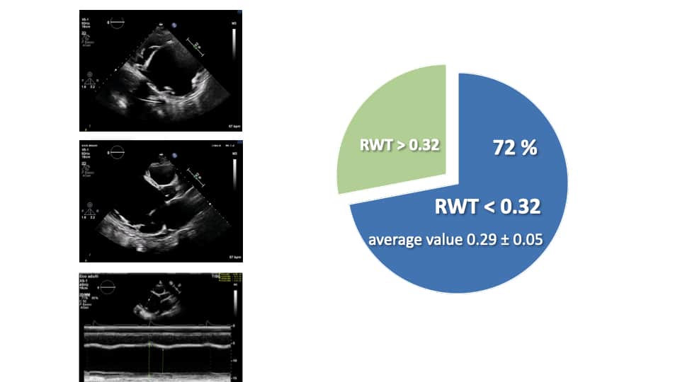 Figura 1: RWT (spessore di parete regionale, parametro usato per esprimere il pattern geometrico del ventricolo sinistro) <0,32 è indice di atrofia cardiaca. Età media dei 45 pazienti: 10.3 anni (±2,9 anni); 72% di essi presentava RWT < 0,32 (0,29 ± 0,05) alla prima valutazione