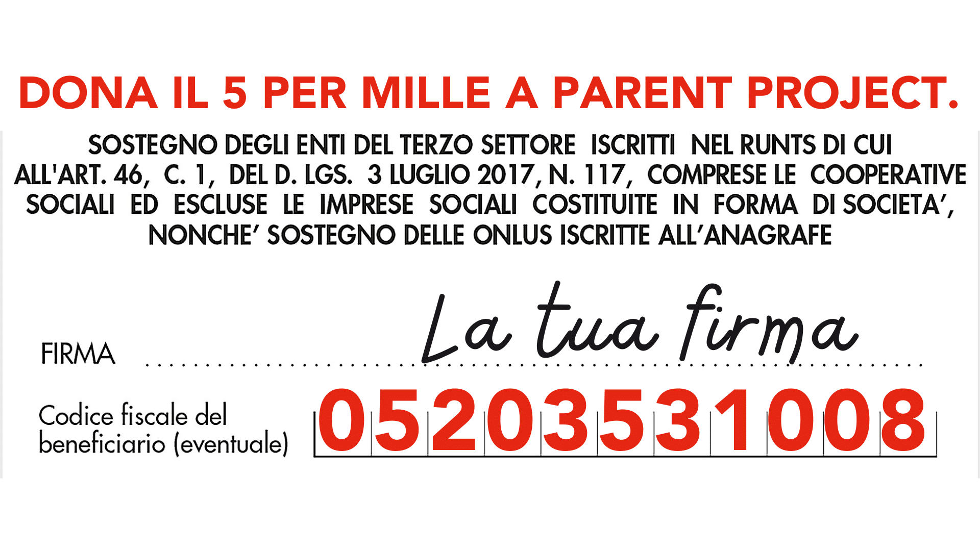 Chi compila il modello 730 oppure il modello Redditi PF dal commercialista o al CAF deve inserire la propria firma ed il codice fiscale di Parent Project aps (05203531008) nel riquadro “Sostegno degli Enti del Terzo Settore iscritti nel Runts di cui all’art. 46, c. 1, del d.lgs. 3 luglio 2017, n. 117, comprese le cooperative sociali ed escluse le imprese sociali costituite in forma di società, nonché sostegno delle Onlus iscritte all’Anagrafe”.